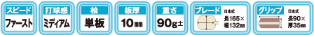 ■角型ヒノキ単板 ■打球感:ミディアム ■板厚:10mm ■重さ:90g±5 ■スピード:ファースト